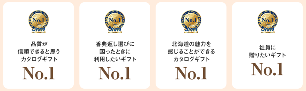 リンベルのカタログギフトは⽇本マーケティングリサーチ機構が2022年12⽉に実施したブランドイメージ調査において4部⾨においてNo.1に選ばれるなど、実績が豊富!